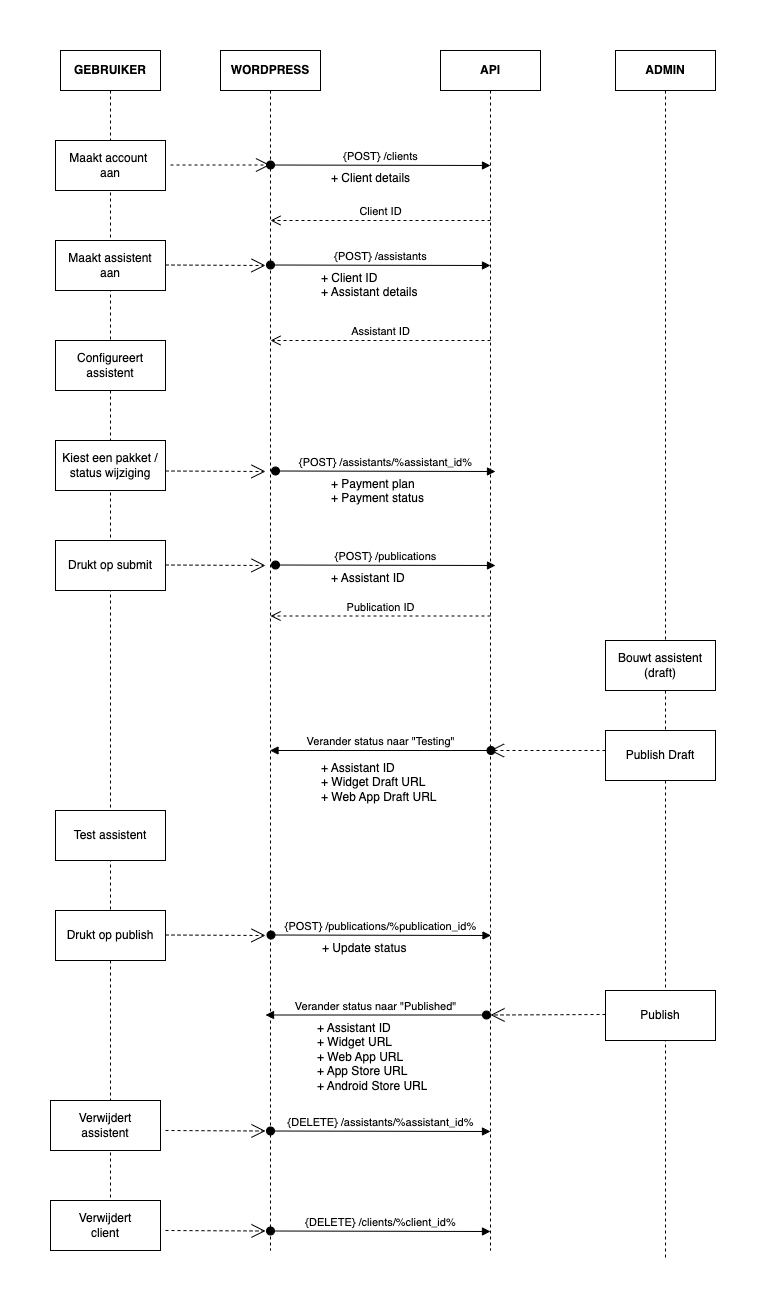 De communicatie tussen het WordPress dashboard en de API wordt in deze diagram duidelijk gemaakt: